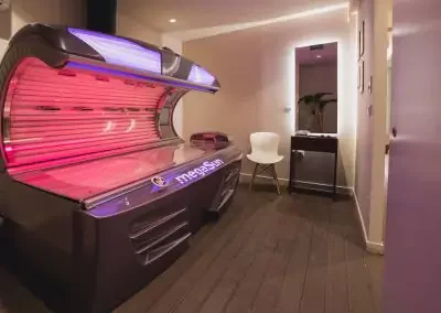 Ο χώρος ακολουθεί όλες τις προδιαγραφές της ΕΟΤΜ (ΕΛΛΗΝΙΚΗΣ ΟΜΟΣΠΟΝΔΙΑΣ ΤΕΧΝΗΤΟΥ ΜΑΥΡΙΣΜΑΤΟΣ ). Ο κορυφαίος και απόλυτα ισορροπημένος συνδυασμός λαμπών Mega Sun© UVA, UVB, Blue Light Therapy και Collagen Therapy καθώς και ο έλεγχος αυτών από το CPI Smart σύστημα διαχείρισης και απόδοσης, εγγυώνται υψηλά επίπεδα ασφάλειας και αποτελέσματος.