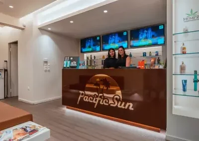 Σχεδιάσαμε το Pacific Sun Solarium με γνώμονα την απόλυτη ασφάλεια και υγιεινή στο μαύρισμα. Το ειδικά εκπαιδευμένο προσωπικό μας είναι έτοιμο να σας προσφέρει μια μοναδική εμπειρία με εξαιρετικά αποτελέσματα. Χαλαρώστε σε ένα χώρο 120τ.μ, μίνιμαλ αισθητικής, άνεσης και γήινων χρωμάτων.